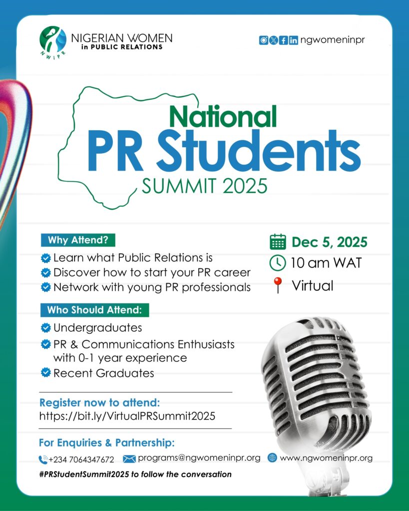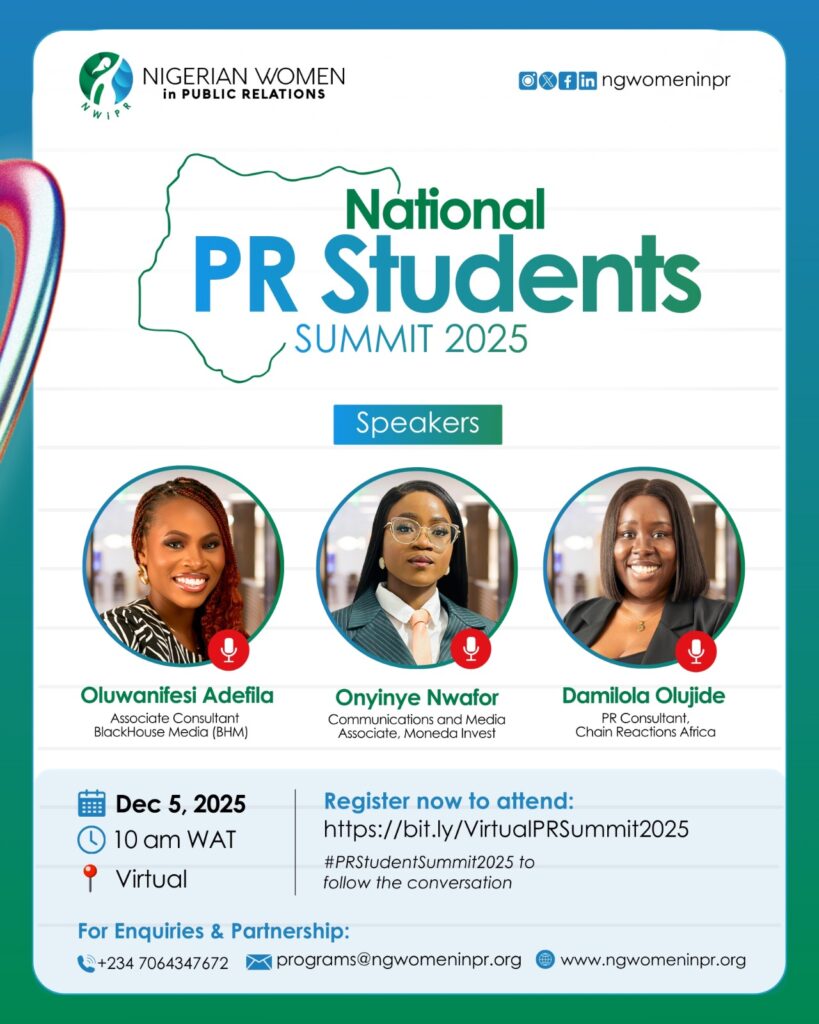 Nigerian Women in Public Relations (NWiPR) has announced the National Public Relations Students Summit 2025, scheduled to hold virtually on Friday, December 5th, 2025.